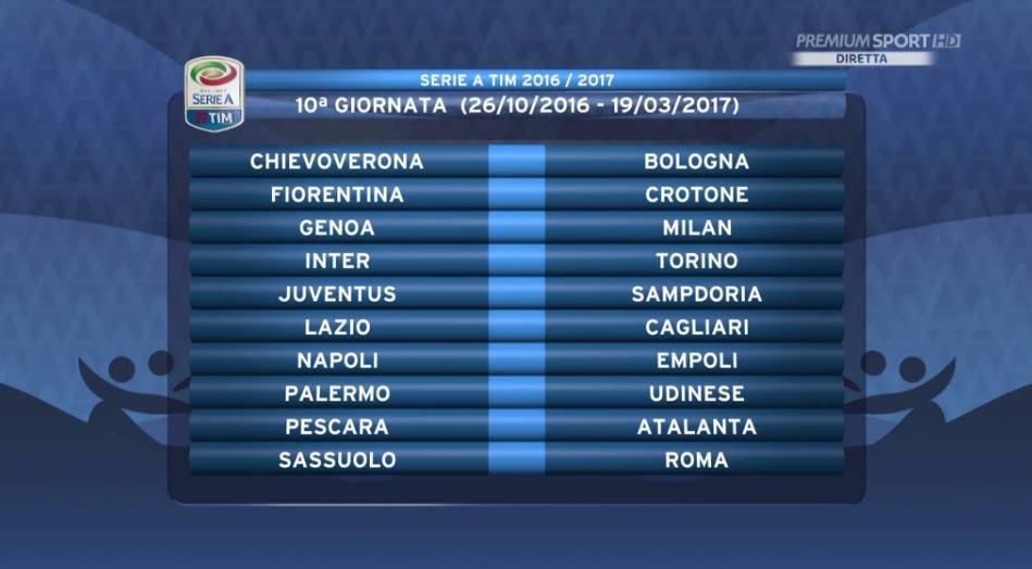 10ª GIORNATA — Chievo-Bologna, Fiorentina-Crotone, Genoa-Milan, Inter-Torino, Juventus-Sampdoria, Lazio-Cagliari, Napoli-Empoli, Palermo-Udinese, Pescara-Atalanta, Sassuolo-Roma.