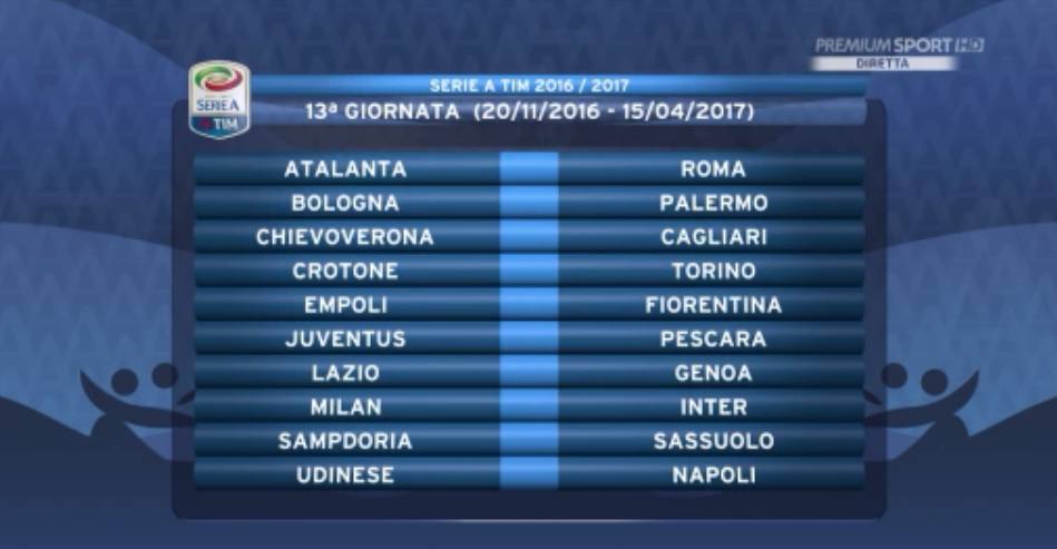 13ª GIORNATA — Atalanta-Roma, Bologna-Palermo, Chievo-Cagliari, Crotone-Torino, Empoli-Fiorentina, Juventus-Pescara, Lazio-Genoa, Milan-Inter, Sampdoria-Sassuolo, Udinese-Napoli.