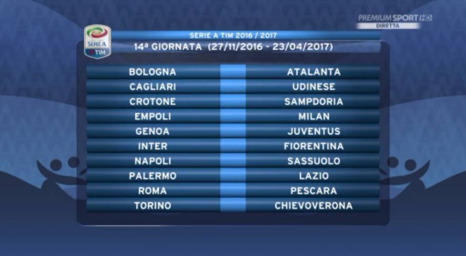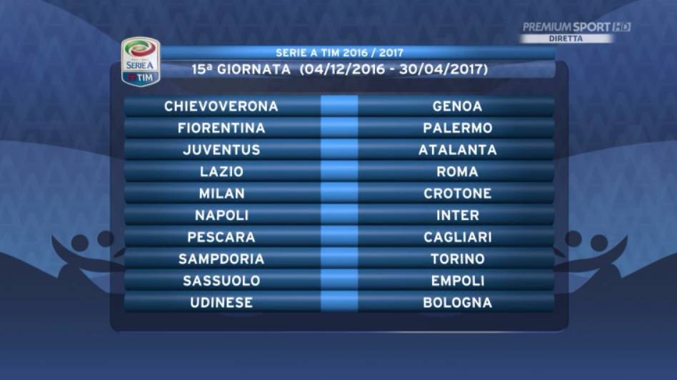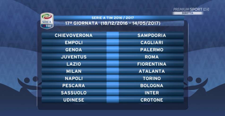 17ª GIORNATA — Chievo-Sampdoria, Empoli-Cagliari, Genoa-Palermo, Juventus-Roma, Lazio-Fiorentina, Milan-Atalanta, Napoli-Torino, Pescara-Bologna, Sassuolo-Inter, Udinese-Crotone.
