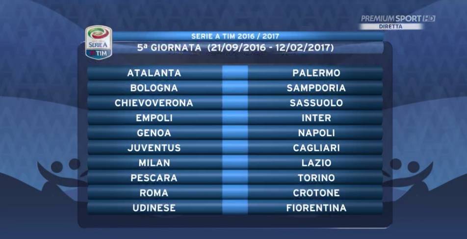 5ª GIORNATA — Atalanta-Palermo, Bologna-Sampdoria, Chievo-Sassuolo, Empoli-Inter, Genoa-Napoli, Milan-Lazio, Juventus-Cagliari, Pescara-Torino, Roma-Crotone, Udinese-Fiorentina.
