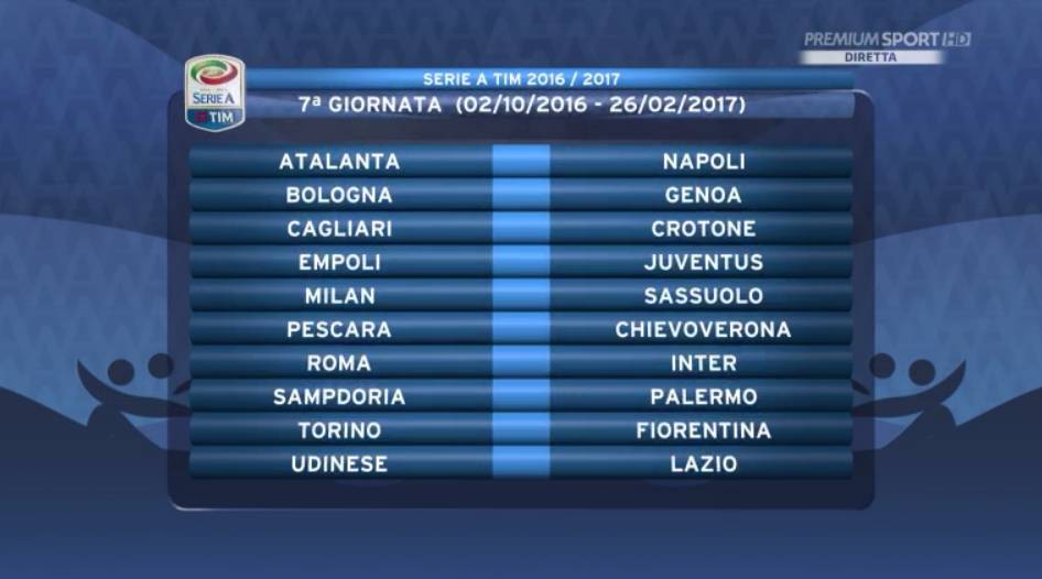 7ª GIORNATA — Atalanta-Napoli, Bologna-Genoa, Cagliari-Crotone, Empoli-Juventus, Milan-Sassuolo, Pescara-Chievo, Roma-Inter, Sampdoria-Palermo, Torino-Fiorentina, Udinese-Lazio.