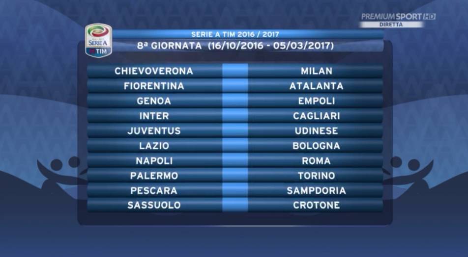 8ª GIORNATA — Chievo-Milan, Fiorentina-Atalanta, Genoa-Empoli, Inter-Cagliari, Juventus-Udinese, Lazio-Bologna, Napoli-Roma, Palermo-Torino, Pescara-Sampdoria, Sassuolo-Crotone.