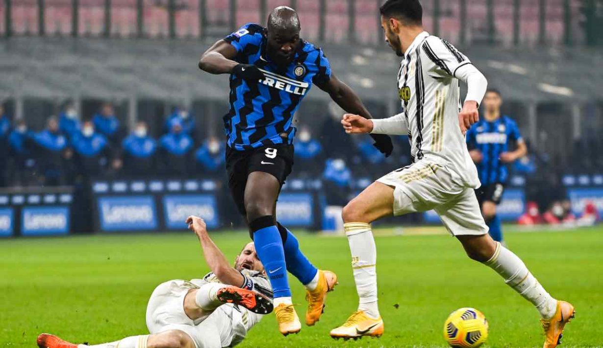Romelu Lukaku (cx) dell'Inter in azione contro Leonardo Bonucci e Gianluca Frabotta durante la partita di Serie A contro la...