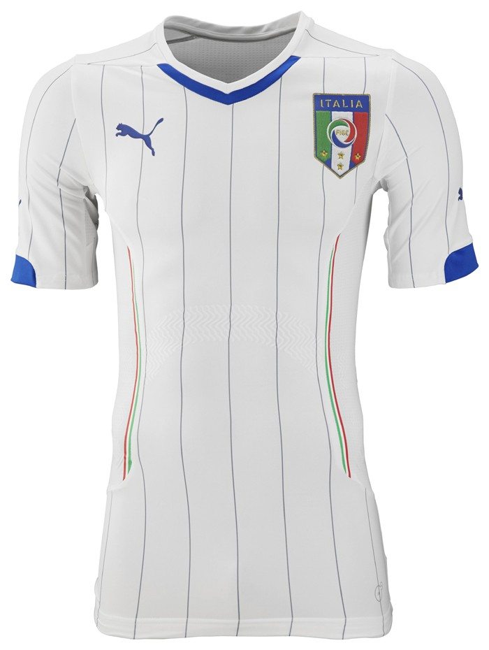 In occasione del primo giorno di ritiro della nazionale italiana in vista dell’amichevole contro la Spagna del 5 marzo, la Figc ha presentato le nuove maglie con le quali l’Italia affronterà i Mondiali di Brasile 2014. La nuova divisa dell’Italia debutterà proprio contro la Spagna e si presenta come una maglia molto innovativa: il design scelto da Puma in collaborazione con la Federcalcio, è ispirato alla tradizione dell’industria artigianale italiana. La vestibilità è slim, con colletto stile polo e abbottonatura su misura. Sui fianchi ci sono due inserti bianchi, mentre sulle maniche e all’interno del colletto è richiamato il tricolore della bandiera italiana.\r\n\r\nAncora più rivoluzionaria la seconda maglia, bianca con sottili strisce verticali e i tricolori sui fianchi. Nel colletto e sulle maniche è richiamato il colore azzurro della prima divisa. Il font esclusivo della Figc e altri particolari, rimandano alla tradizione artigianale nostrana.\r\n